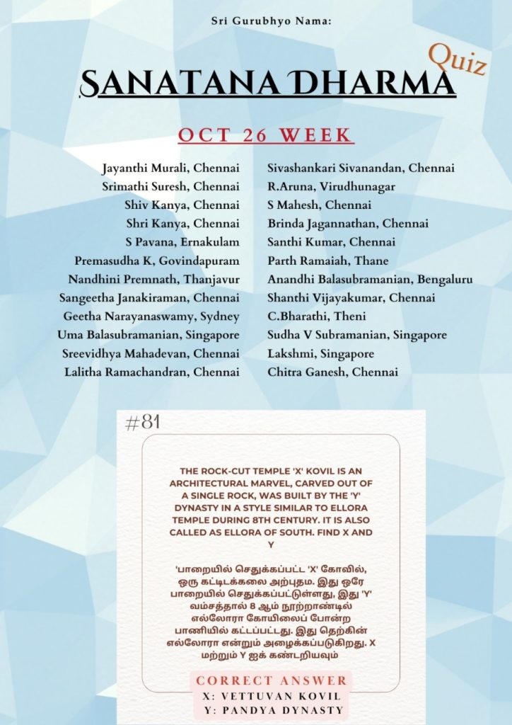 Home » Sanathana Dharma Quiz » Oct 26, 2025 – Correct Answer Oct 26, 2025 – Correct Answer Recent Quiz Results Oct 26, 2025 – Correct Answer Oct 19, 2025 – Correct Answer Oct 12, 2025 – Correct Answer Oct 5, 2025 – Correct Answer Sep 28, 2025 – Correct Answer Sep 21, 2025 – Correct Answer Sep 14, 2025 – Correct Answer Sep 7, 2025 – Correct Answer Aug 31, 2025 – Correct Answer Aug 24, 2025 – Correct Answer