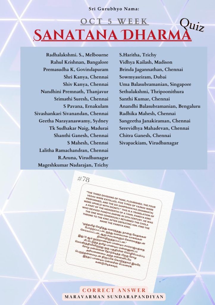 Home » Sanathana Dharma Quiz » Oct 5, 2025 – Correct Answer Oct 5, 2025 – Correct Answer Recent Quiz Results Oct 5, 2025 – Correct Answer Sep 28, 2025 – Correct Answer Sep 21, 2025 – Correct Answer Sep 14, 2025 – Correct Answer Sep 7, 2025 – Correct Answer Aug 31, 2025 – Correct Answer Aug 24, 2025 – Correct Answer Aug 17, 2025 – Correct Answer Aug 10, 2025 – Correct Answer Aug 3, 2025 – Correct Answer